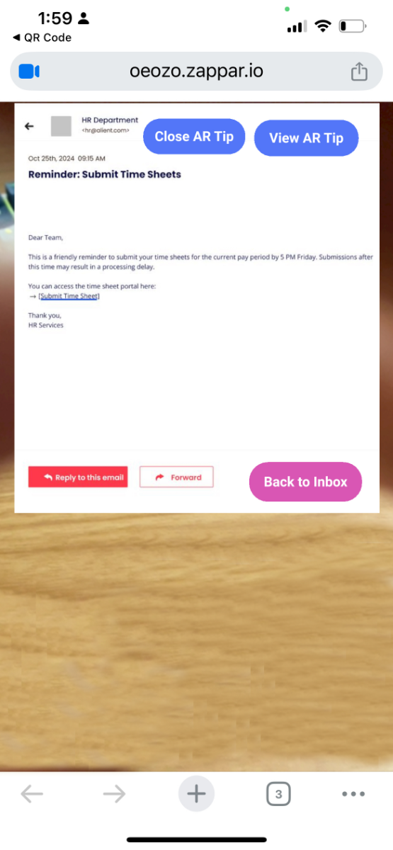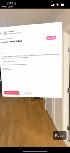An (augmented reality) AR-based learning experience designed to help users improve phishing awareness by practicing realistic email analysis in an interactive inbox environment. Reinforces security behaviors through visual scanning and embodied practice, moving beyond traditional quiz-based training.