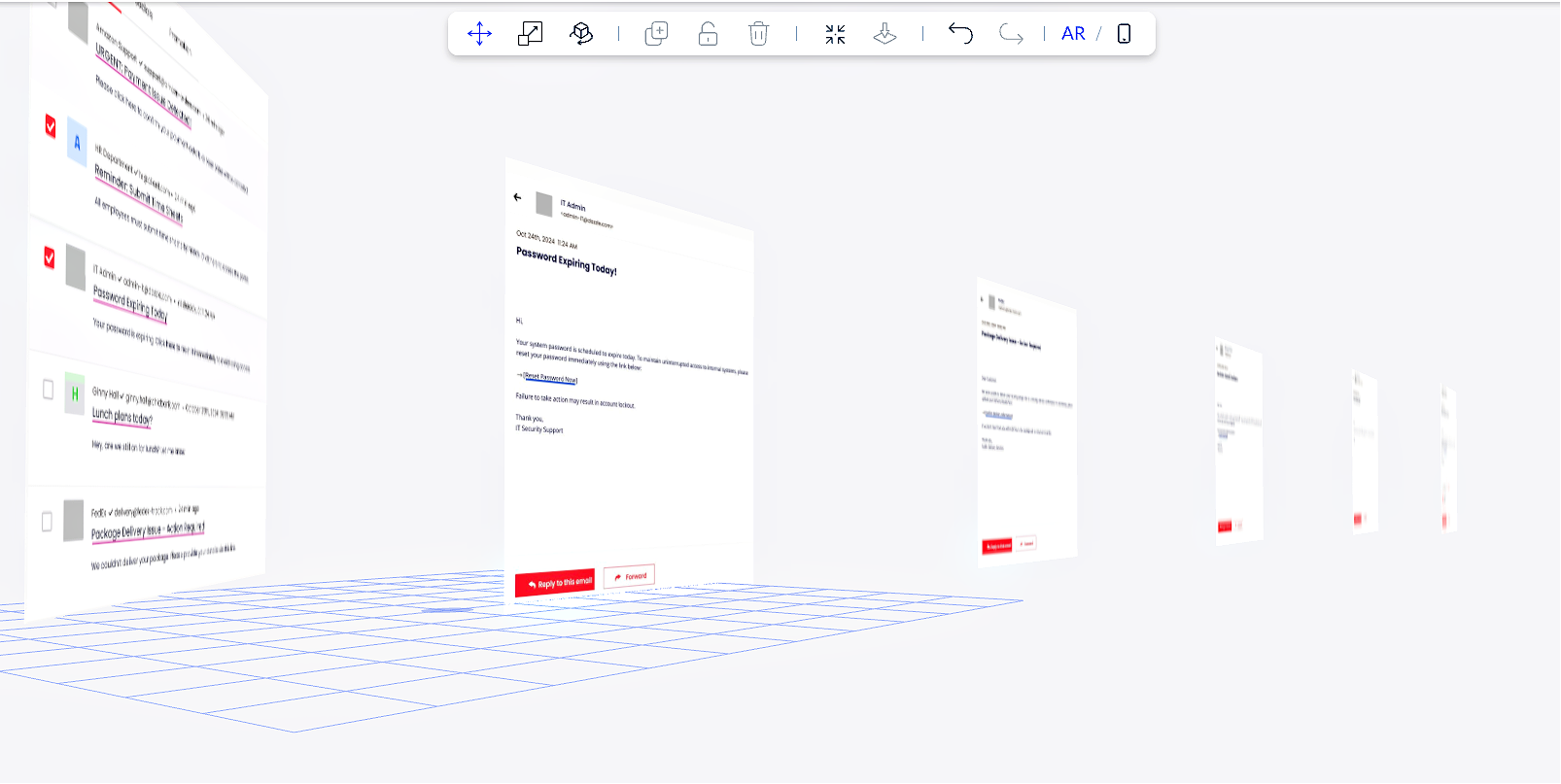I designed an AR learning prototype that simulates realistic email analysis in an interactive inbox environment. The experience leverages embodied learning and spatial cues to build visual muscle memory, training users to spot red flags through active pattern recognition, not just recall. The project explores how AR can reinforce critical security behaviors more effectively than conventional methods.