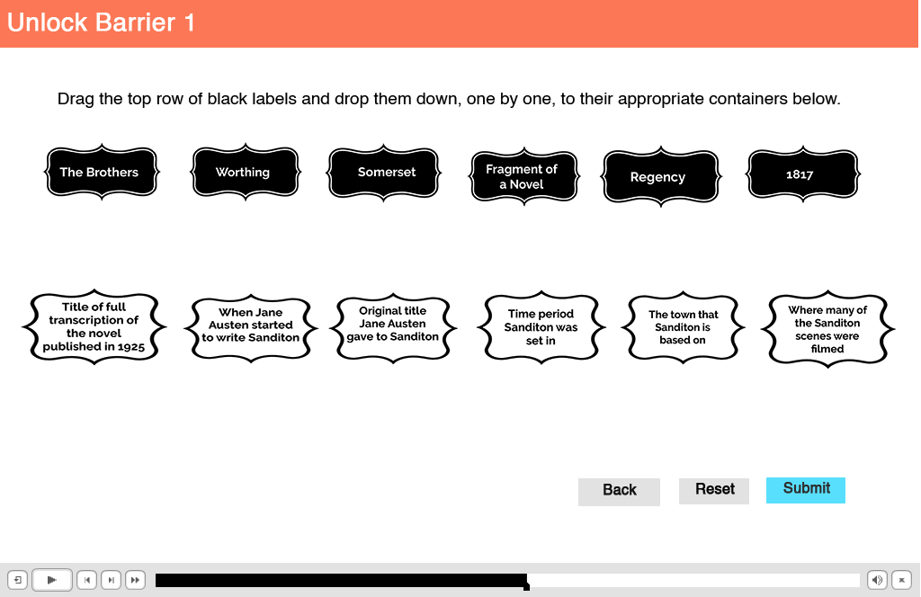 These are screenshots from interactive activities I designed using Adobe Captivate. The first was created as part of a fan campaign for the renewal of Sanditon, while the second showcases a content sorting exercise. Click on image to expand.